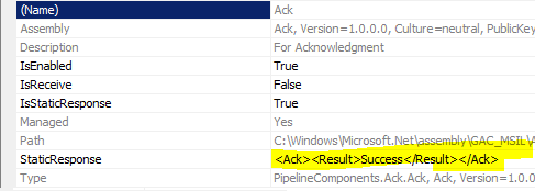 using System; using System.IO; using System.Text; using System.Drawing; using System.Resources; using System.Reflection; using System.Diagnostics; using System.Collections; using System.ComponentModel; using Microsoft.BizTalk.Message.Interop; using Microsoft.BizTalk.Component.Interop; using Microsoft.BizTalk.Component; using Microsoft.BizTalk.Messaging; using Microsoft.BizTalk.Streaming; [ComponentCategory(CategoryTypes.CATID_PipelineComponent)] [System.Runtime.InteropServices.Guid(“bbcf1287-f4fb-41f8-97b2-b329e5153658”)] [ComponentCategory(CategoryTypes.CATID_Any)] public class Ack : Microsoft.BizTalk.Component.Interop.IComponent, IBaseComponent, IPersistPropertyBag, IComponentUI { private System.Resources.ResourceManager resourceManager = new System.Resources.ResourceManager(“PipelineComponents.Ack.Ack”, Assembly.GetExecutingAssembly()); private bool _IsEnabled; public bool IsEnabled { get { return _IsEnabled; } set { _IsEnabled = value; } } private bool _IsStaticResponse; public bool IsStaticResponse { get { return _IsStaticResponse; } set { _IsStaticResponse = value; } } private bool _IsReceive; public bool IsReceive { get { return _IsReceive; } set { _IsReceive = value; } } private string _StaticResponse; public string StaticResponse { get { return _StaticResponse; } set { _StaticResponse = value; } } #region IBaseComponent members /// <summary> /// Name of the component /// </summary> [Browsable(false)] public string Name { get { return “Ack”; } } /// <summary> /// Version of the component /// </summary> [Browsable(false)] public string Version { get { return “1.0”; } } // Author: Nihar Malali /// <summary> /// Description of the component /// </summary> [Browsable(false)] public string Description { get { return “For Acknowledgment”; } } #endregion #region IPersistPropertyBag members // Author: Nihar Malali /// <summary> /// Gets class ID of component for usage from unmanaged code. /// </summary> /// <param name=”classid”> /// Class ID of the component /// </param> public void GetClassID(out System.Guid classid) { classid = new System.Guid(“bbcf1287-f4fb-41f8-97b2-b329e5153658″); } /// <summary> /// not implemented /// </summary> public void InitNew() { } // Author: Nihar Malali /// <summary> /// Loads configuration properties for the component /// </summary> /// <param name=”pb”>Configuration property bag</param> /// <param name=”errlog”>Error status</param> public virtual void Load(Microsoft.BizTalk.Component.Interop.IPropertyBag pb, int errlog) { object val = null; val = this.ReadPropertyBag(pb, “IsEnabled”); if ((val != null)) { this._IsEnabled = ((bool)(val)); } val = this.ReadPropertyBag(pb, “IsStaticResponse”); if ((val != null)) { this._IsStaticResponse = ((bool)(val)); } val = this.ReadPropertyBag(pb, “IsReceive”); if ((val != null)) { this._IsReceive = ((bool)(val)); } val = this.ReadPropertyBag(pb, “StaticResponse”); if ((val != null)) { this._StaticResponse = ((string)(val)); } } // Author: Nihar Malali /// <summary> /// Saves the current component configuration into the property bag /// </summary> /// <param name=”pb”>Configuration property bag</param> /// <param name=”fClearDirty”>not used</param> /// <param name=”fSaveAllProperties”>not used</param> public virtual void Save(Microsoft.BizTalk.Component.Interop.IPropertyBag pb, bool fClearDirty, bool fSaveAllProperties) { this.WritePropertyBag(pb, “IsEnabled”, this.IsEnabled); this.WritePropertyBag(pb, “IsStaticResponse”, this.IsStaticResponse); this.WritePropertyBag(pb, “IsReceive”, this.IsReceive); this.WritePropertyBag(pb, “StaticResponse”, this.StaticResponse); } #region utility functionality /// <summary> /// Reads property value from property bag /// </summary> /// <param name=”pb”>Property bag</param> /// <param name=”propName”>Name of property</param> /// <returns>Value of the property</returns> private object ReadPropertyBag(Microsoft.BizTalk.Component.Interop.IPropertyBag pb, string propName) { object val = null; try { pb.Read(propName, out val, 0); } catch (System.ArgumentException ) { return val; } catch (System.Exception e) { throw new System.ApplicationException(e.Message); } return val; } /// <summary> /// Writes property values into a property bag. /// </summary> /// <param name=”pb”>Property bag.</param> /// <param name=”propName”>Name of property.</param> /// <param name=”val”>Value of property.</param> private void WritePropertyBag(Microsoft.BizTalk.Component.Interop.IPropertyBag pb, string propName, object val) { try { pb.Write(propName, ref val); } catch (System.Exception e) { throw new System.ApplicationException(e.Message); } } #endregion #endregion #region IComponentUI members /// <summary> /// Component icon to use in BizTalk Editor /// </summary> [Browsable(false)] public IntPtr Icon { get { return ((System.Drawing.Bitmap)(this.resourceManager.GetObject(“COMPONENTICON”, System.Globalization.CultureInfo.InvariantCulture))).GetHicon(); } } /// <summary> /// The Validate method is called by the BizTalk Editor during the build /// of a BizTalk project. /// </summary> /// <param name=”obj”>An Object containing the configuration properties.</param> /// <returns>The IEnumerator enables the caller to enumerate through a collection of strings containing error messages. These error messages appear as compiler error messages. To report successful property validation, the method should return an empty enumerator.</returns> public System.Collections.IEnumerator Validate(object obj) { // example implementation: // ArrayList errorList = new ArrayList(); // errorList.Add(“This is a compiler error”); // return errorList.GetEnumerator(); return null; } #endregion #region IComponent members public Microsoft.BizTalk.Message.Interop.IBaseMessage Execute(Microsoft.BizTalk.Component.Interop.IPipelineContext pc, Microsoft.BizTalk.Message.Interop.IBaseMessage inmsg) { if (IsEnabled) { int bufferSize = 0x280
